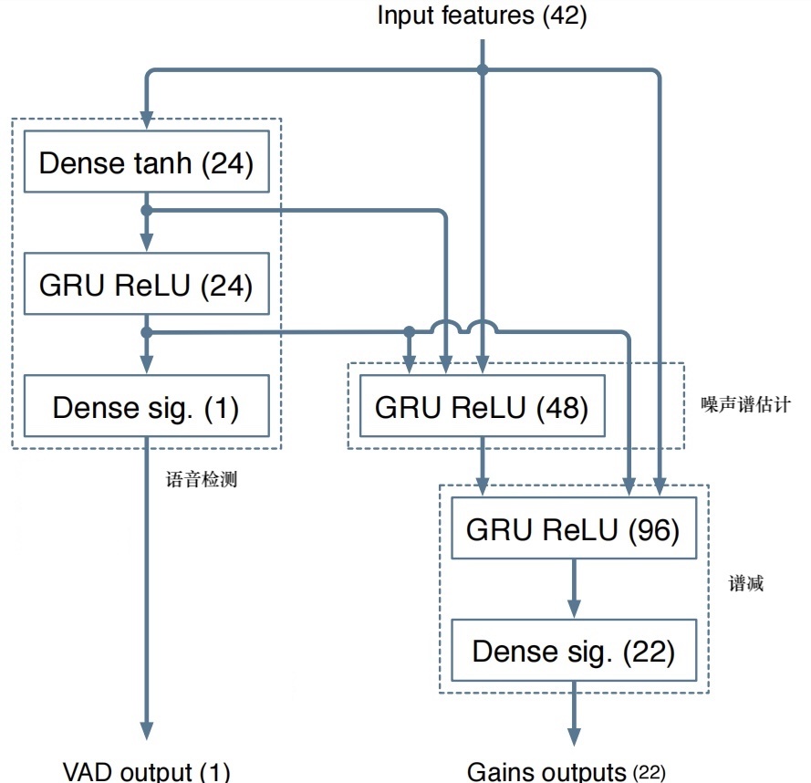 - 神经网络的数据如下图所示,主要包括三个循环层,作用分别为VAD、噪声谱估计、噪声消除,实验表明,实验表明使用GRU网络的效果优于LSTM网络。