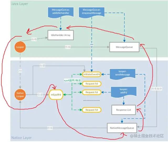 - 而且Java层MessageQueue在 next() 方法中的死循环中,通过JNI调用了 Native层MQ的 pollOnce,驱动了Native层去处理Native层消息