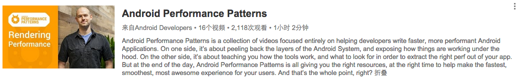 2015新年伊始,Google发布了关于Android性能优化典范的专题,一共16个短视频,每个3-5分钟,帮助开发者创建更快更优秀的Android App。课程专题不仅仅介绍了Android系统中有关性能问题的底层工作原理,同时也介绍了如何通过工具来找出性能问题以及提升性能的建议。主要从三个方面展开,Android的渲染机制,内存与GC,电量优化。下面是对这些问题和建议的总结梳理。