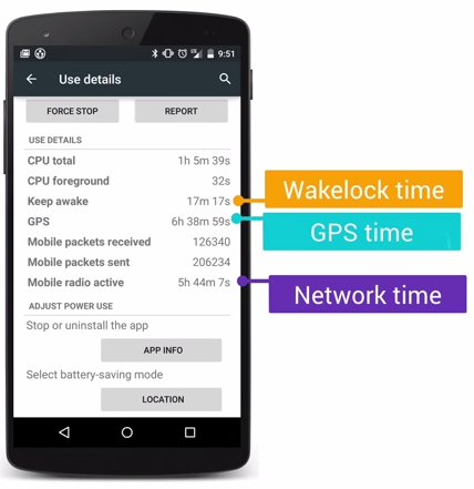 我们可以通过手机设置选项找到对应App的电量消耗统计数据。我们还可以通过Battery Historian Tool来查看详细的电量消耗。