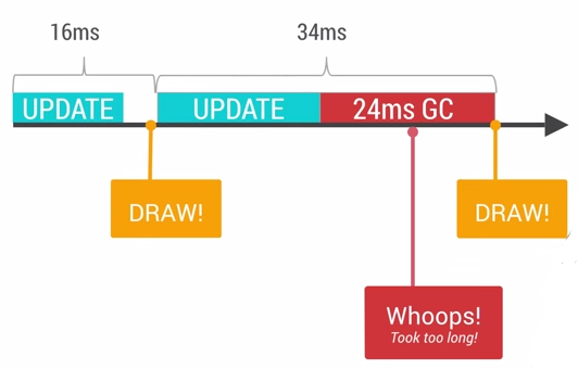 通常来说,单个的GC并不会占用太多时间,但是大量不停的GC操作则会显著占用帧间隔时间(16ms)。如果在帧间隔时间里面做了过多的GC操作,那么自然其他类似计算,渲染等操作的可用时间就变得少了。
