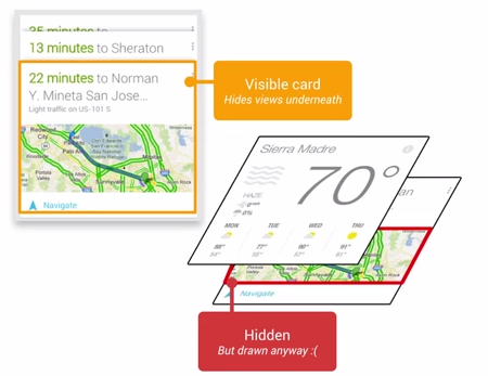 有一个窍门是我们可以通过执行几个APIs方法来显著提升绘制操作的性能。前面有提到过,非可见的UI组件进行绘制更新会导致Overdraw。例如NavDrawer从前置可见的Activity滑出之后,如果还继续绘制那些在Nav Drawer里面不可见的UI组件,这就导致了Overdraw。为了解决这个问题,Android系统会通过避免绘制那些完全不可见的组件来尽量减少Overdraw。那些Nav Drawer里面不可见的View就不会被执行浪费资源。