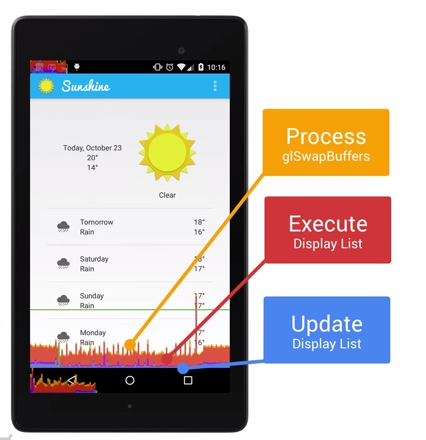 从Android M系统开始,系统更新了GPU Profiling的工具来帮助我们定位UI的渲染性能问题。早期的CPU Profiling工具只能粗略的显示出Process,Execute,Update三大步骤的时间耗费情况。