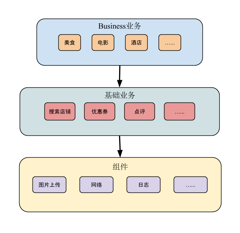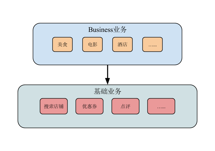 但并不是这样划分就OK了,好像大众点评这种超级APP,每个Business业务都能分成很多基础业务。例如,美食业务,可以搜索商铺、预约、使用优惠券、点评、签到等;同时,电影业务也有搜索、优惠券、点评等。所以,搜索商铺、优惠券、点评这种基础业务,可以独立出来,被多个Busine ss业务使用。