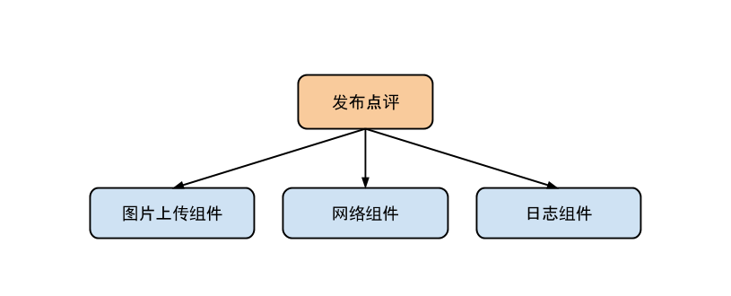 还是拿大众点评做例子,点评基础业务,发布点评需要上传图片、网络提交、记录本地日志等,那么需要调用上传图片组件、网络组件、日志组件等。