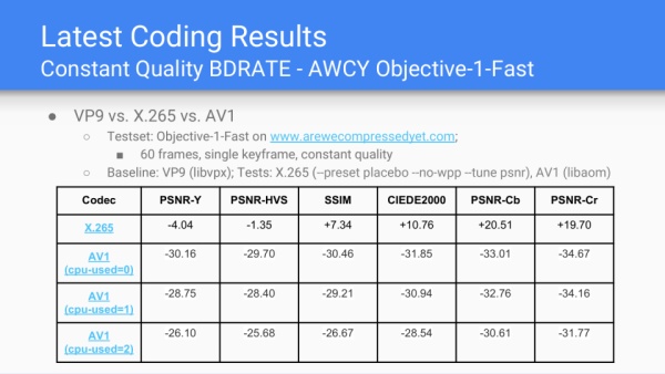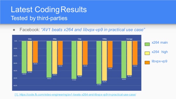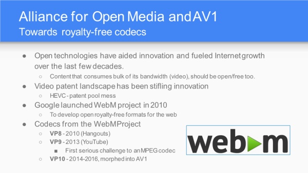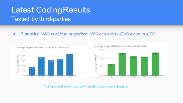 AV1的理念是OpenMedia,目标即免税编码,进而用来和ITU高专利费的HEVC、VCC对抗。