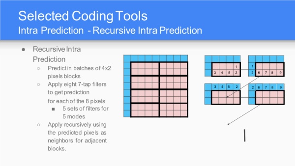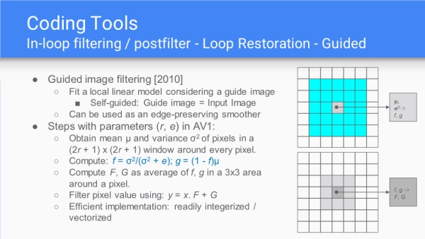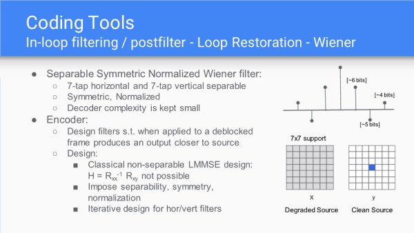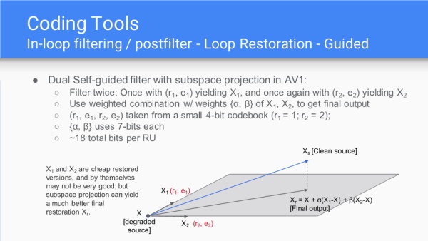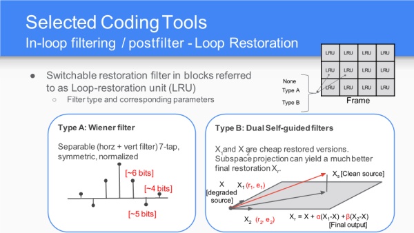 环路重建单元有两种类型,7抽头维纳滤波或双自引导滤波器,这一部分是之前任何编码算法中所没有的。