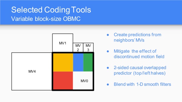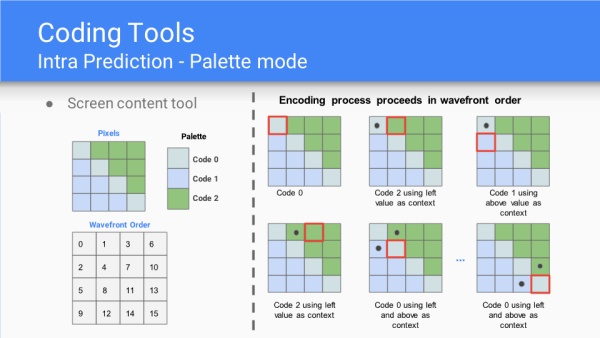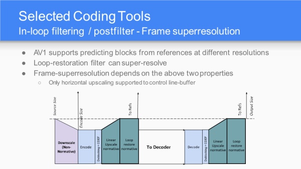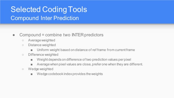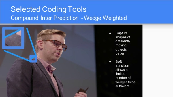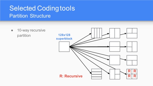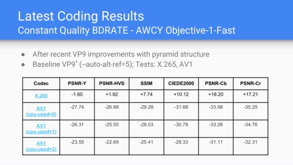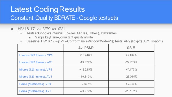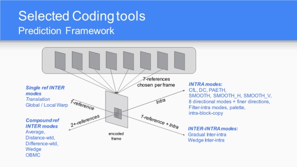 AV1采纳百家众长,以VP10为基础,算法和工具融合了Mozilla的Daala、Cisco的Thor,未来差异化的编码器可能会越来越少。性能指标目标是比VP9还能压缩30%的冗余。