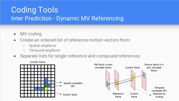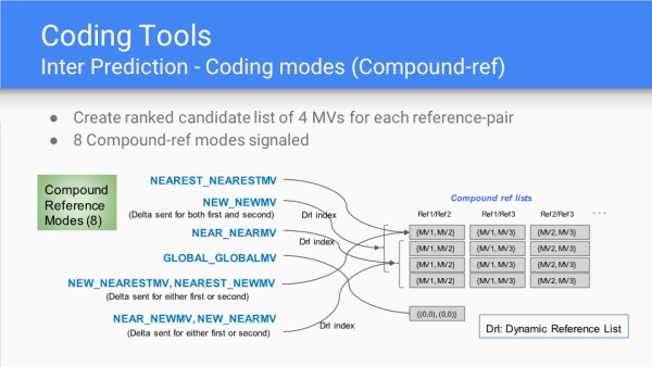 复合帧间预测的场景,排序了4个MV组成的候选列表;同时有8种复合模式下的MV,分别是最近MV、邻近MV、最新MV、全局MV、新的最近MV、最近新的MV、邻近的新MV和新的邻近MV。其中"最近"、"邻近"是空间域上的关系,"新"是时间域上的关系。