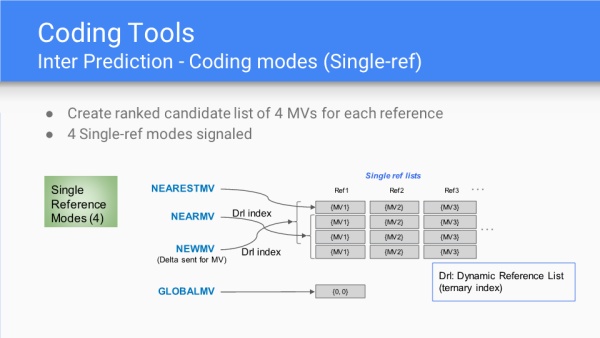 单帧帧间预测的场景,排序了4个MV组成的候选列表;同时有4种单帧模式下的MV,分别是最近MV、邻近MV、最新MV和全局MV。