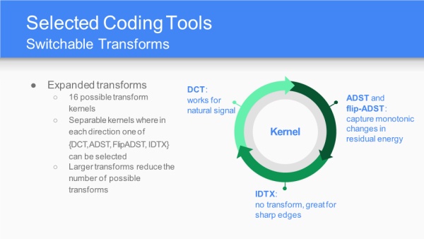 提供16种变换基,对于普通信号进行DCT变换,对于边缘不进行变换IDTX,对于残差能量单调变化进行ADST(非对称离散正弦变换)或flip-ADST(翻转非对称离散正弦变换)。