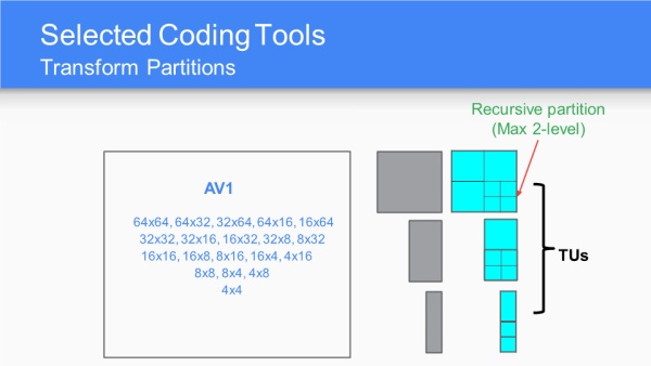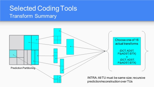 对于帧内预测帧,TU需要有相同尺寸;对于递归预测、重建一定要在TU之上进行;16个变换基是指水平方向和垂直方向DCT、IDX、ADST或flip-ADST的组合。