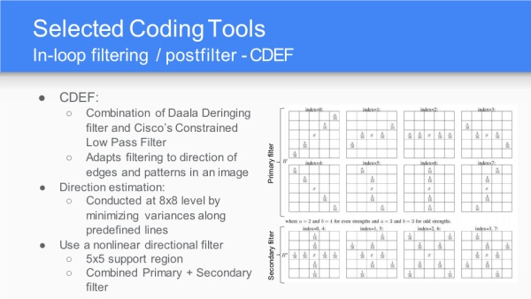 CDEF是一种针对边缘的滤波,由之前Daala和Thor的组合而成;而后进行方向估计与非线性滤波。