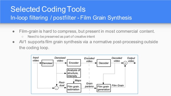 胶片颗粒(Film-grain)特别难以压缩(Film grain - Wikipedia),AV1通过胶片颗粒合成方法在后处理过程中实现,这个后处理过程对于编码循环来说是带外流程。