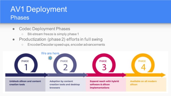 AV1的实施的四个阶段。第一阶段是创建工具,以及Bit-stream freeze(大概是码流格式定义);目前处于第二阶段,工具集选择以及桌面浏览器实现(软编软解实现);第三阶段是软硬混合(硬件加速)以及纯硬件实现;第四阶段是获得主流芯片的支持。