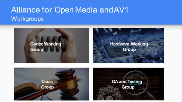 AOM的四个工作组:编码工作组、硬件工作组(毕竟AV1算法复杂度特别高)、助教组和测试组。