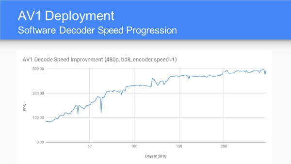 解码优化进展,横坐标2018年日期,纵坐标帧率,随着优化的进行达到每秒300帧的解码性能。