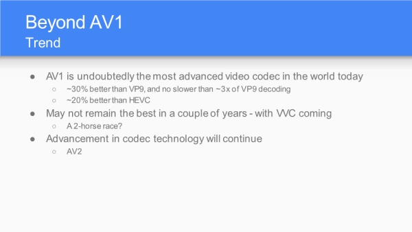 AV1是当下最好的编码器,比VP9压缩能力提升30%(达到了之前预设的目标),比HEVC压缩能力提升20%;但面对即将到来的VVC是有一定挑战,AV2将会提 上日程。