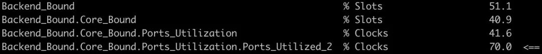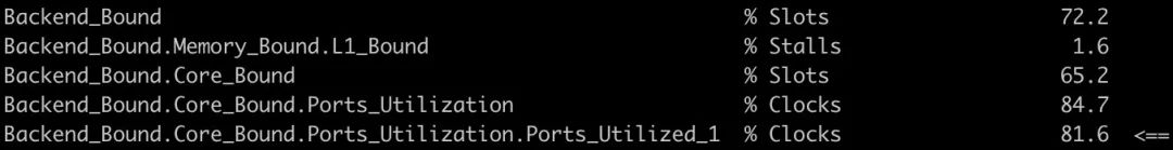 程序的IPC只有1,内部瓶颈也显示集中在『后端』内部的部件利用效率(大多时间只利用了一个port),此时乱序执行并没有发挥作用。