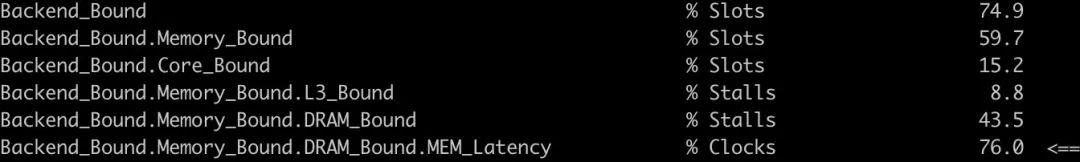 可以看到,这一次的瓶颈到了穿透缓存后的内存访存延迟上,但同时内存访问的带宽并没有被充分利用。这是因为指令窗口内虽然并发度不低,不过因为缓存层次系统的特性,内层循环中的多个访存指令,其实最终都是等待同一行被从内存加载到缓存。导致真正触发的底层访存压力并不足以打满传输带宽,但是程序却表现出了较大的停顿。