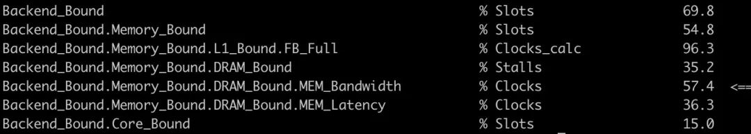 TMAM(Top-down Microarchitecture Analysis Method)是一种利用CPU内部PMU(Performance Monitoring Unit)计数器来从上至下分解定位部件瓶颈的手段。例如在最顶层,首先以标定最大指令完成速率为标准(例如Skylake上为单周期4条微指令),如果无法达到标定,则认为瓶颈在于未能充分利用部件。进一步细分以指令池为分界线,如果指令池未满,但是取指部件又无法满负荷输出微指令,就表明『前端』存在瓶颈。另一种无法达到最大指令速率的因素,是『前端』虽然在发射指令到指令池,但是因为错误的预测,最终没有产出有效结果,这类损耗则被归入『错误预测』。除此以外的问题就是因为指令池调度执行能力不足产生的反压停顿,这一类被归为『后端』瓶颈。进一步例如『后端』瓶颈还可以根据,停顿发生时,是否伴随了ALU利用不充分,是否伴随了Load/Store Buffer满负荷等因素,继续进行分解细化,形成了一套整体的分析方法。例如针对Intel,这一过程可以通过pmu-tools来被自动完成,对于指导精细化的程序瓶颈分析和优化往往有很大帮助。