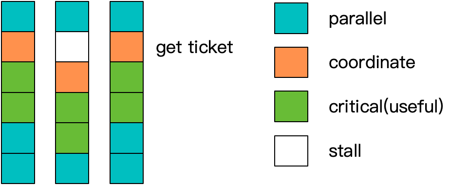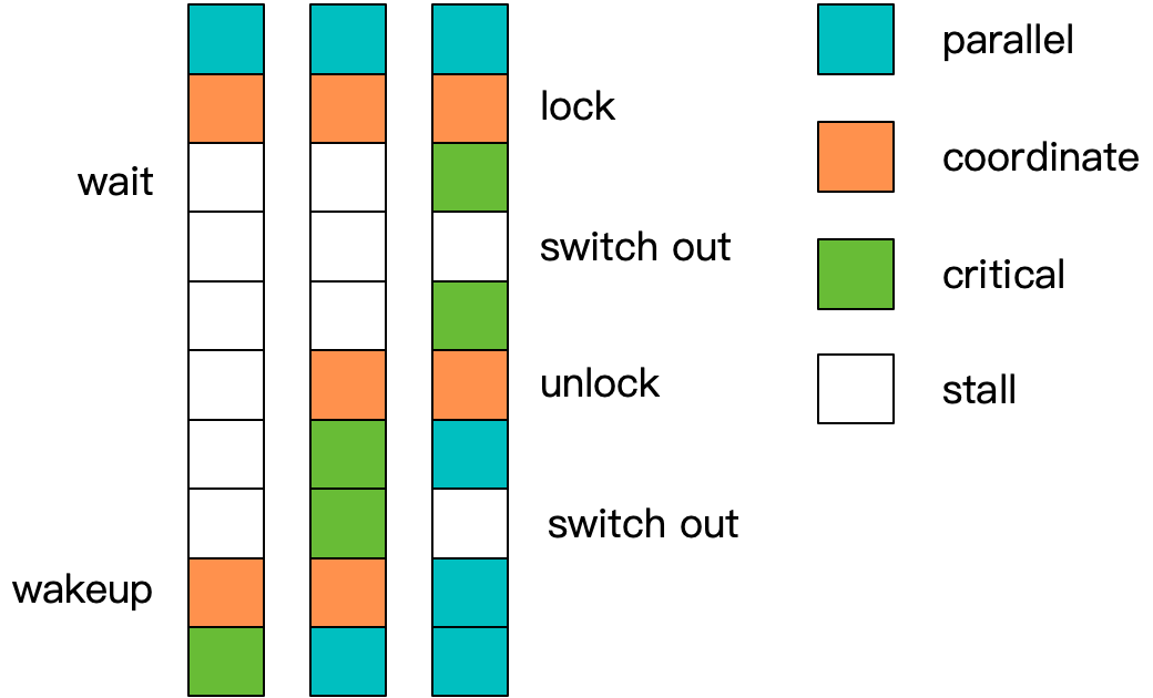 最基本的临界区保护方法,就是互斥技术。这是一种典型的悲观锁算法,也就是假设临界区高概率存在竞争,因此需要先利用底层提供的机制进行仲裁,成功获得所有权之后,才进入临界区运行。这种互斥算法,有一个典型的全局阻塞问题,也就是上图中,当临界区内的线程发生阻塞,或被操作系统换出时,会出现一个全局执行空窗。这个执行空窗内,不仅自身无法继续操作,未获得锁的线程也只能一同等待,造成了阻塞放大的现象。但是对于并行区,单一线程的阻塞只会影响自身,同样位于在上图中的第二次阻塞就是如此。