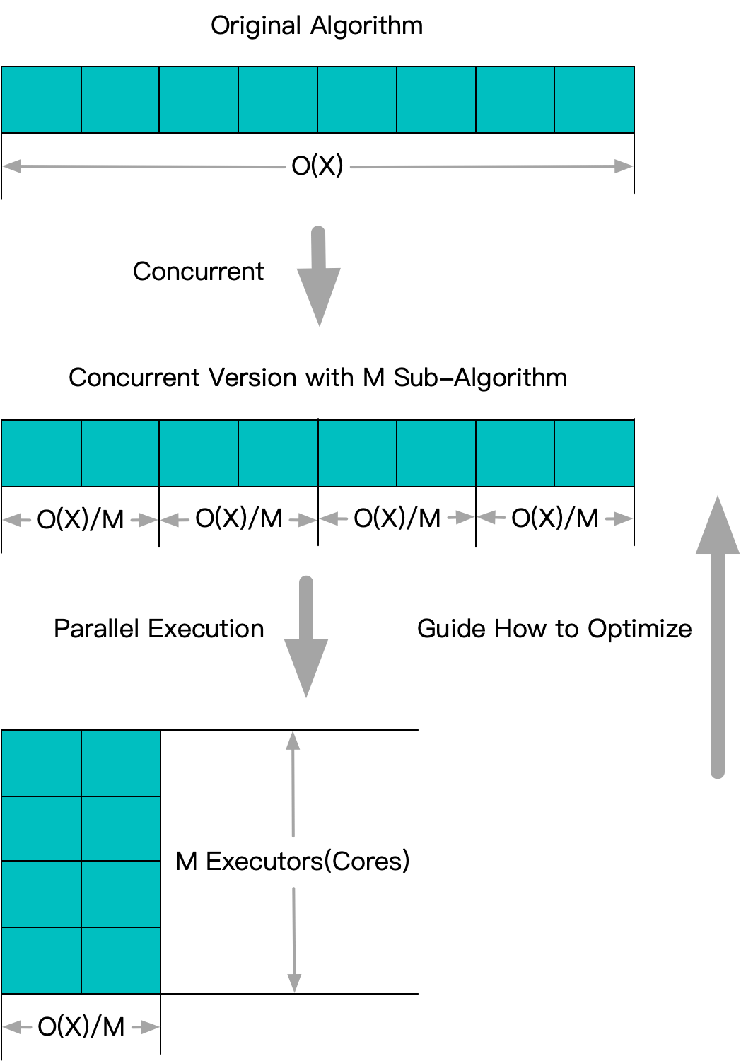 需要注意的是还有一条从下而上的反向剪头,主要表达了,为了正确高效地利用并行执行部件,往往会反向指导上层的并发设计,例如正确地数据对齐,合理的临界区实现等。虽然加速看似完全是由底层并行执行部件的能力所带来的,程序设计上只需要做到子任务拆分即可。但是现阶段,执行部件对上层还无法达到透明的程度,导致这条反向依赖对于最终的正确性和性能依然至关重要。既了解算法,又理解底层设计,并结合起来实现合理的并发改造,也就成为了工程师的一项重要技能。