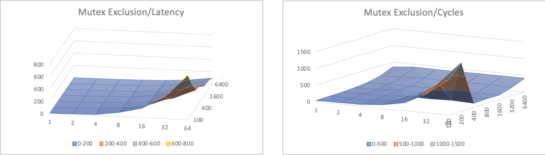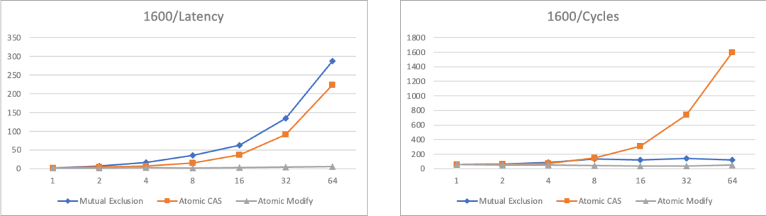 其中Latency项除以临界区规模进行了归一,便于形象展示临界区负载变化下的临界区保护开销趋势,因此跨不同负载等级下不具备横向可比性。Cycles项表示多线程协同完成总量为同样次数的累加,用到的CPU周期总和,总体随临界区负载变化有少量天然倾斜。100/1600两个截面图将3中算法叠加在一起展示,便于直观对比。
