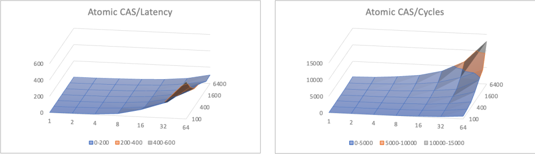 这里采用多线程累加作为案例,分别采用上锁后累加,累加后CAS提交,以及累加后FAA(Fetch And Add)提交三种方法对全局累加结果做临界区保护。针对不同的并发数量,以及不同的临界区负载,可以形成如下的三维曲线图。