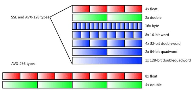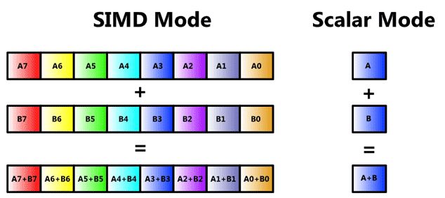 其中一个重要的细粒度并行能力就是SIMD(Single Instruction Multiple Data),也就是多个执行单元,同时对多个数据应用相同指令进行计算的模式。在经典分类上,一般单核心CPU被归入SISD(Single Instruction Single Data),而多核心CPU被归入MIMD(Mingle Instruction Multiple Data),而GPU才被归入SIMD的范畴。但是现代CPU上,除了多核心的MIMD基础模型,也同时附带了细粒度SIMD计算能力。