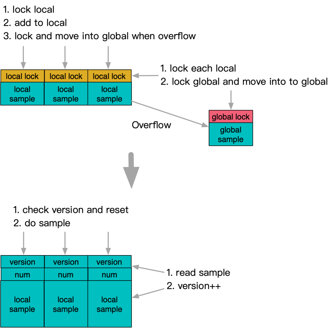 另一个例子是Percentile分位值统计,由于抽样数据是一个多元素容器,而且分位值统计需要周期清空重算,因此常规也是采用了互斥保护的方法。不过如果引入版本号机制,将清空操作转交给计数线程自己完成,将sample区域的读写完全分离。在这个基础上,就可以比较简单的做到线程安全,而且也不用引入原子修改。严格意义上,异步清空存在边界样本收集丢失的可能性,不过因为核心的蓄水池抽样算发本身也具有随机性,在监控指标统计领域已经拥有足够精度。
