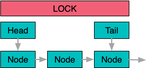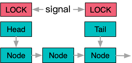 这个方法的缺点是显而易见的,因为队列往往作为多线程驱动的数据中枢位置,大量的竞争下,队列操作被串行很容易影响整体计算的并行度。因此一个自然的改进点是,将队列头尾分开保护,先将生产者和消费者解耦开,只追加必要的同步操作来保证不会过度入队和出队。这也是Jave中LinkedBlockingQueue所使用的做法。