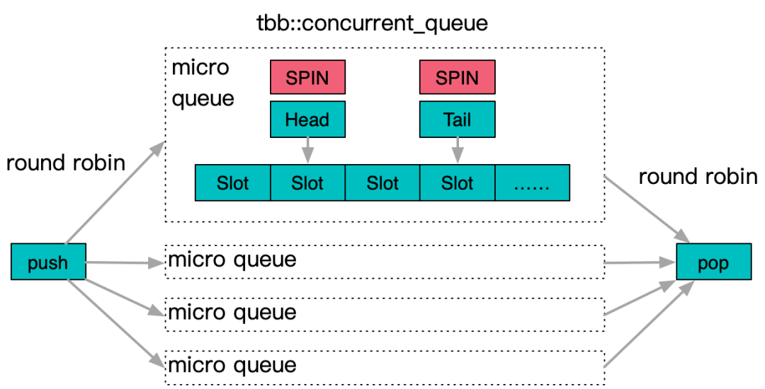 而另一个方向是队列分片,即将队列拆解成多个子队列,通过领取token的方式选择子队列,而子队列内部使用传统队列算法,例如tbb::concurrent_queue就是分片队列的典型实现。