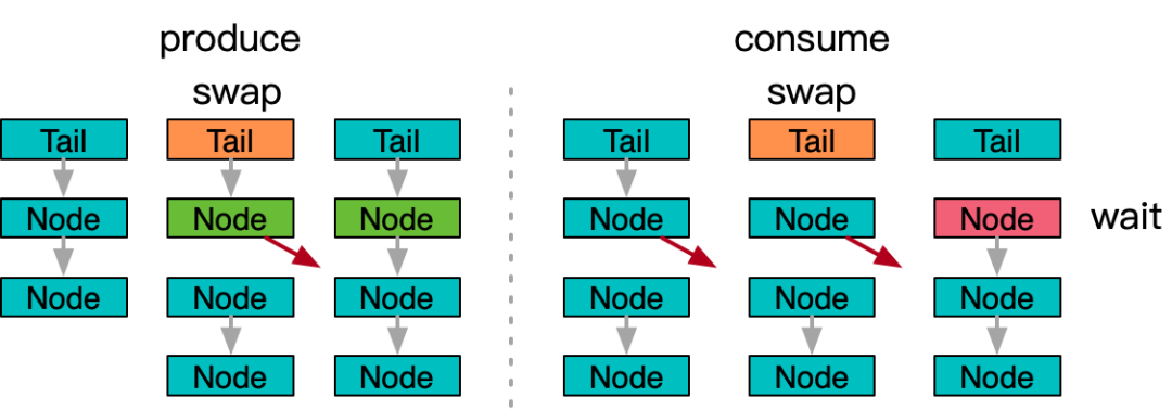 整个队列只持有队尾,而无队头。在生产侧,第一步直接将新节点和当前尾指针进行原子交换,之后再将之前的队尾衔接到新节点之后。因为无论是否存在竞争,入队操作都能通过固定的两步完成,因此入队算法是Wait Free的。不过这给消费侧带来的麻烦,消费同样从一个原子交换开始,将队尾置换成nullptr,之后的消费动作就是遍历取到的单链表。但是因为生产操作分了两部完成,此时可能发现部分节点尚处于『断链』状态,由于消费者无从知晓后续节点信息,只能轮询等待生产者最终完成第二步。所以理论上,生产/消费算法其实甚至不是Lock Free的,因为如果生产者在两阶段中间被换出,那么消费者会被这个阻塞传播影响,整个消费也只能先阻塞住。但是在排队写入fd的场景下,专项优化生产并发是合理,也因此可以获得更好的执行效率。