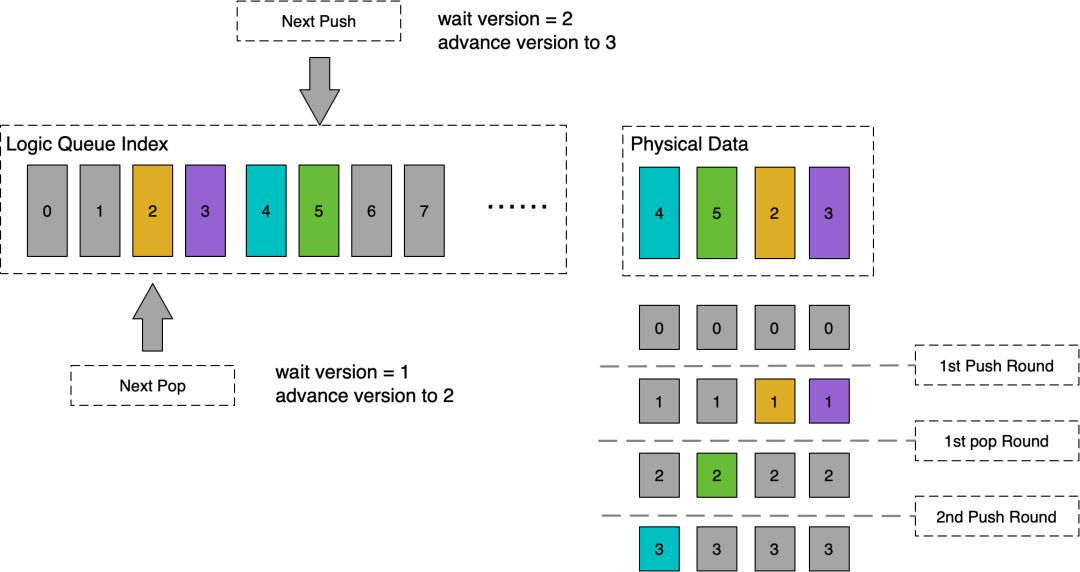 回到babylon::ConcurrentBoundedQueue的设计思路上,其实是将子队列拆分做到极致,将同步量粒度降低到每个数据槽位上。每个入队和出队请求,首先利用原子自增领取一个递增的序号,之后利用循环数组的存储方式,就可以映射到一个具体的数据槽位上。根据操作是入队还是出队, 在循环数组上发生了多少次折叠,就可以在一个数据槽位上形成一个连续的版本序列。例如1号入队和5号出队都对应了1号数据槽位,而1号入队预期的版本转移是0到1,而5号出队的版本转移是2到3。这样针对同一个槽位的入队和出队也可以形成一个连续的版本变更序列,一个领到序号的具体操作,只需要明确检测版本即可确认自己当前是否可以开始操作,并通过自己的版本变更和后续的操作进行同步。