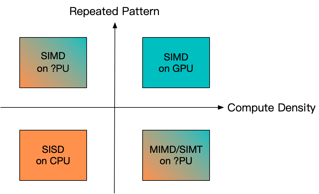 对于一段程序来讲,如果将每读取单位数据,对应的纯计算复杂度大小定义为计算密度,而将算法在不同数据单元上执行的计算流的相同程度定义为模式重复度,那么可以以此将程序划分为4个象限。在大密度可重复的计算负载(典型的重型神经网络计算),和显著小密度和非重复计算负载(例如HTML树状解析)场景下,业界在CPU和GPU的选取上其实是有相对明确“最优解”的。不过对于过渡地带,计算的重复特征没有那么强, 或者运算密度没有那么大的场景下,双方的弱点都会被进一步放大。即便是规整可重复的计算负载,随着计算本身强度减小,传输和启动成本逐渐显著。另一方面,即便是不太规整可重复的计算负载,随着计算负荷加大,核心数不足也会逐渐成为瓶颈。这时候,引入SIMD的CPU和引入SIMT 的GPU间如何选择和使用,就形成了没有那么明确,见仁见智的权衡空间。