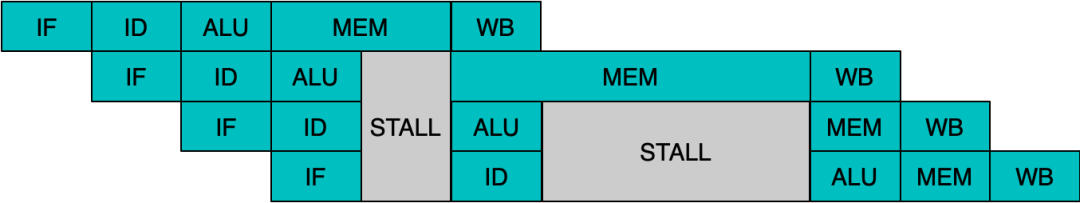 指令简化表达为取指/译码/计算/访存/写回环节,当执行环节遇到数据依赖,以及缓存未命中等场景,就会导致整体停顿的产生。其中MEM环节的影响尤其显著,主要也是因为缓存层次的深化和多核心的共享现象,带来单次访存所需周期数参差不齐的现象越来越严重。上图中的流水线在多层缓存下的表现,可能更像下图所示:
