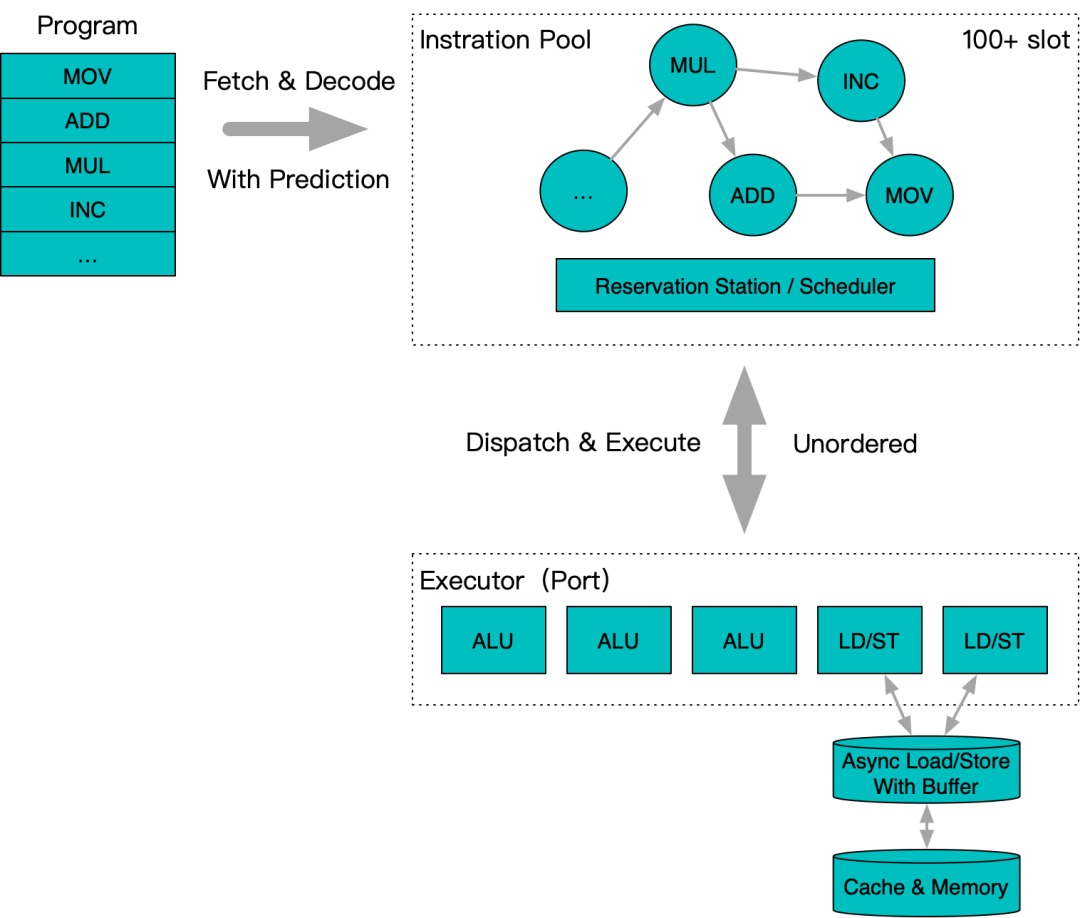 乱序执行系统中,一般会将通过预测维护一个较长的指令序列,并构建一个指令池,通过解析指令池内的依赖关系,形成一张DAG(有向无环图) 组织的网状结构。通过对DAG关系的计算,其中依赖就绪的指令,就可以进入执行态,被提交到实际的执行部件中处理。执行部件类似多线程模型中的工作线程,根据特性细分为计算和访存两类。计算类一般有相对固定可预期的执行周期,而访存类由于指令周期差异较大,采用了异步回调的模型,通过Load/Store Buffer支持同时发起数十个访存操作。