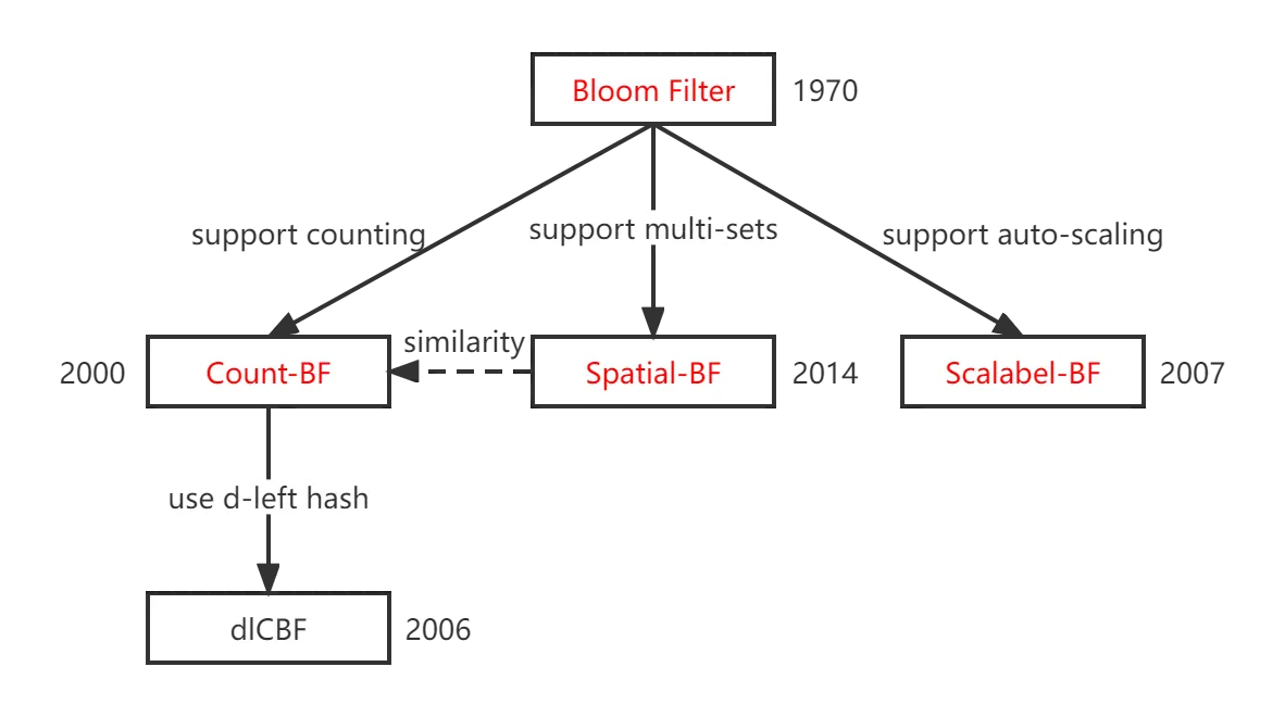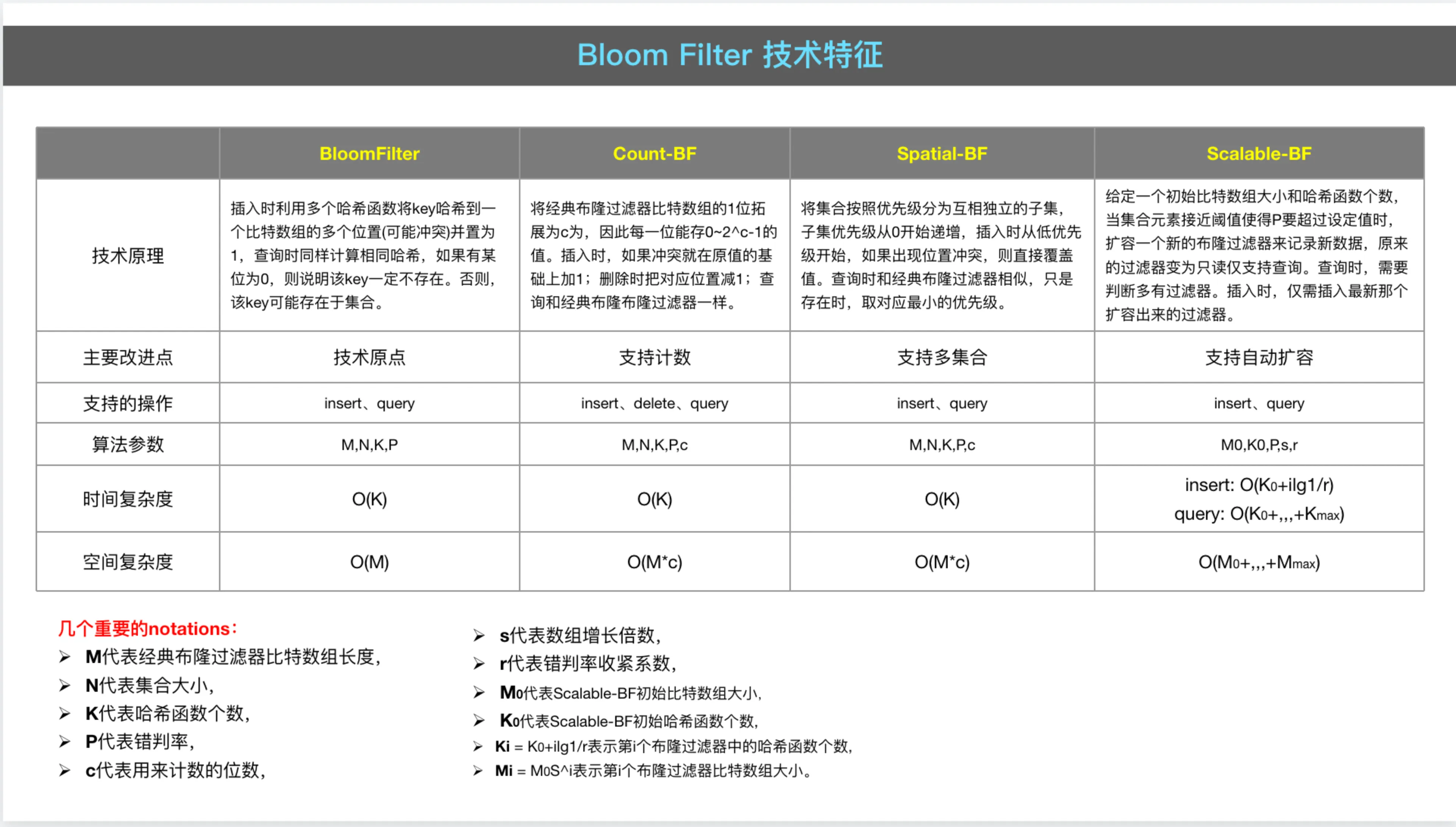 本文从论文着手,从布隆过滤器的起源开始,粗略梳理了几个有代表性的布隆过滤器的原理和应用。其中CBF支持计数,可以用于网络缓存优化;dlCBF是CBF的改进版,有更小的存储空间;Spatial-BF支持多个集合,配合同态加密使用可以用户隐私保护;Scalable-BF支持自动扩容,被Redis作为其布隆过滤器的内部实现。布隆过滤器中的哈希函数选择也是有学问题的,应该选在那些分布均匀计算速度快的,比如Murmur3。哈希函数可以通过不同的策略,由2个生成无限多个。以下是对各种BF技术特征的一个总结: