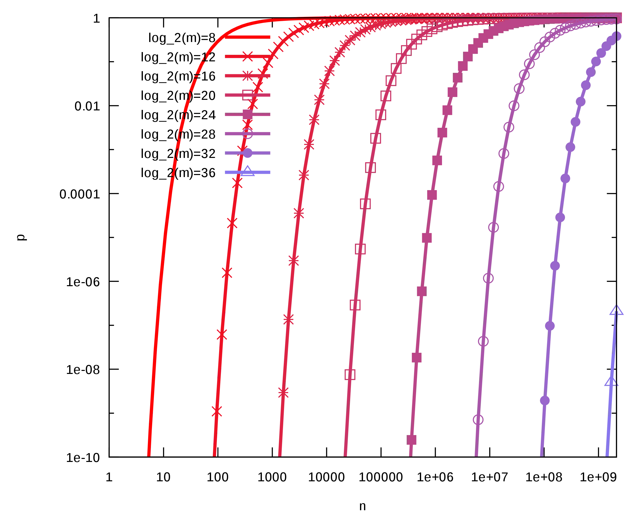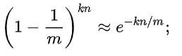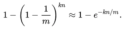 因此,取反,在插入n个元素后,某一位是1的概率就为: