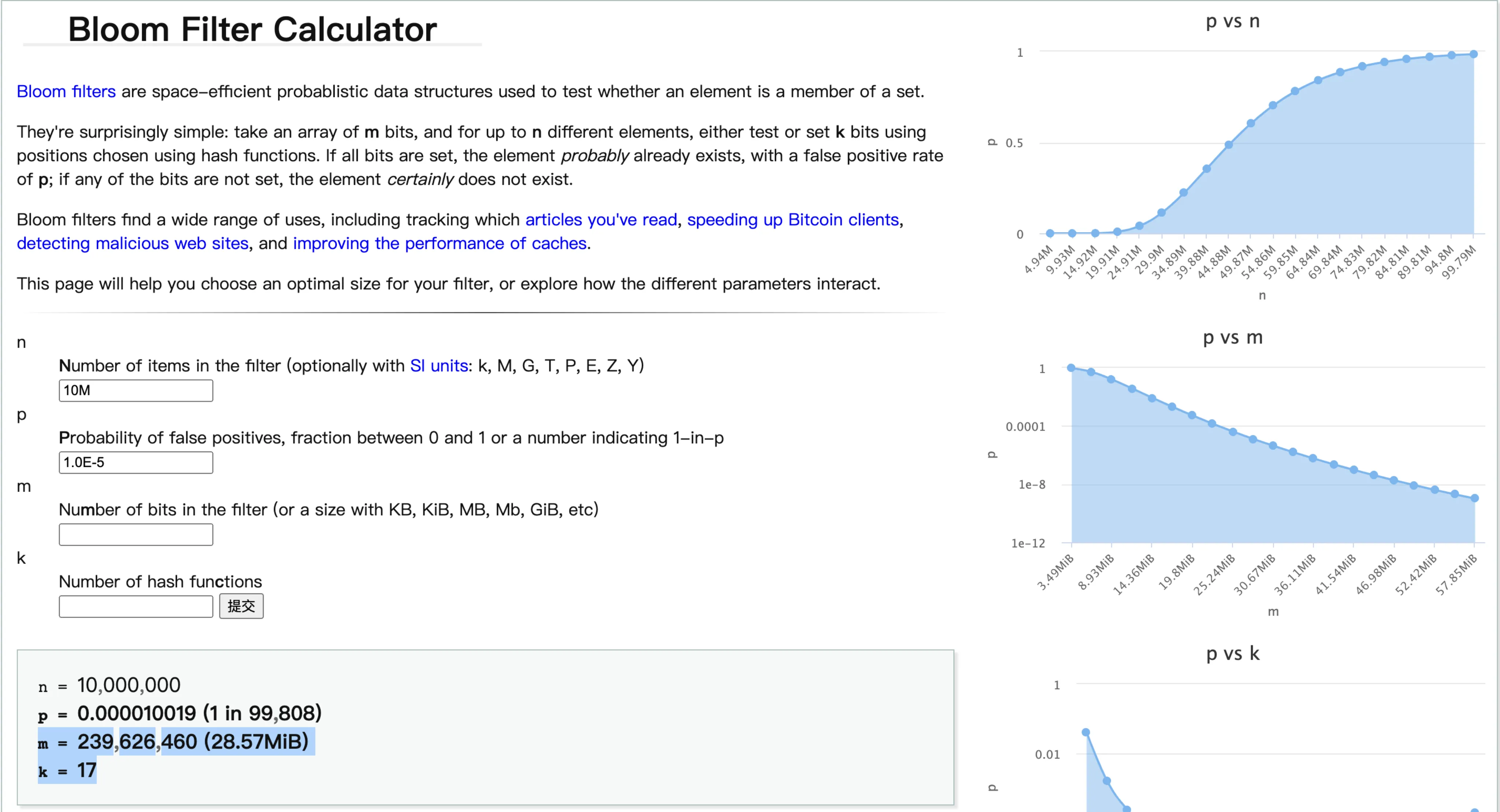 具体计算带入公式即可。下面是一个网站,能帮忙我们快速计算各个参数:Bloom filtercalculator