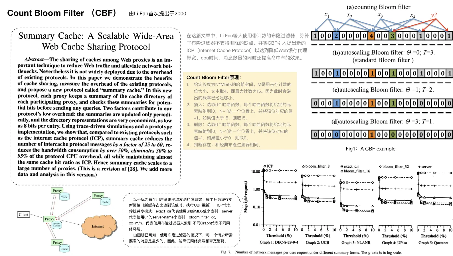 普通的BF其实并不支持删除元素,因为多个元素可能哈希到一个布隆过滤器的同一个位置,如果直接删除该位置的元素,则会影响其他元素的判断。因此,在2000年,在Summary Cache: A Scalable Wide-Area Web Cache Sharing Protocol这篇文章中,LiFan等人使用带计数器的布隆过滤器,弥补了布隆过滤器不支持删除的缺点,并将CBF引入提出新的ICP(Internet Cache Protocol)以达到降低Web缓存代理带宽、cpu时间、消息数量的同时还提高命中率的效果。