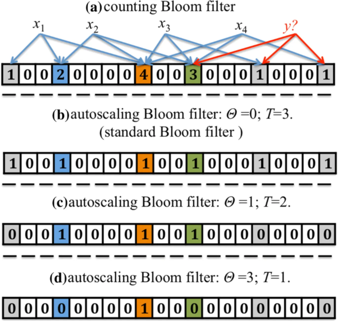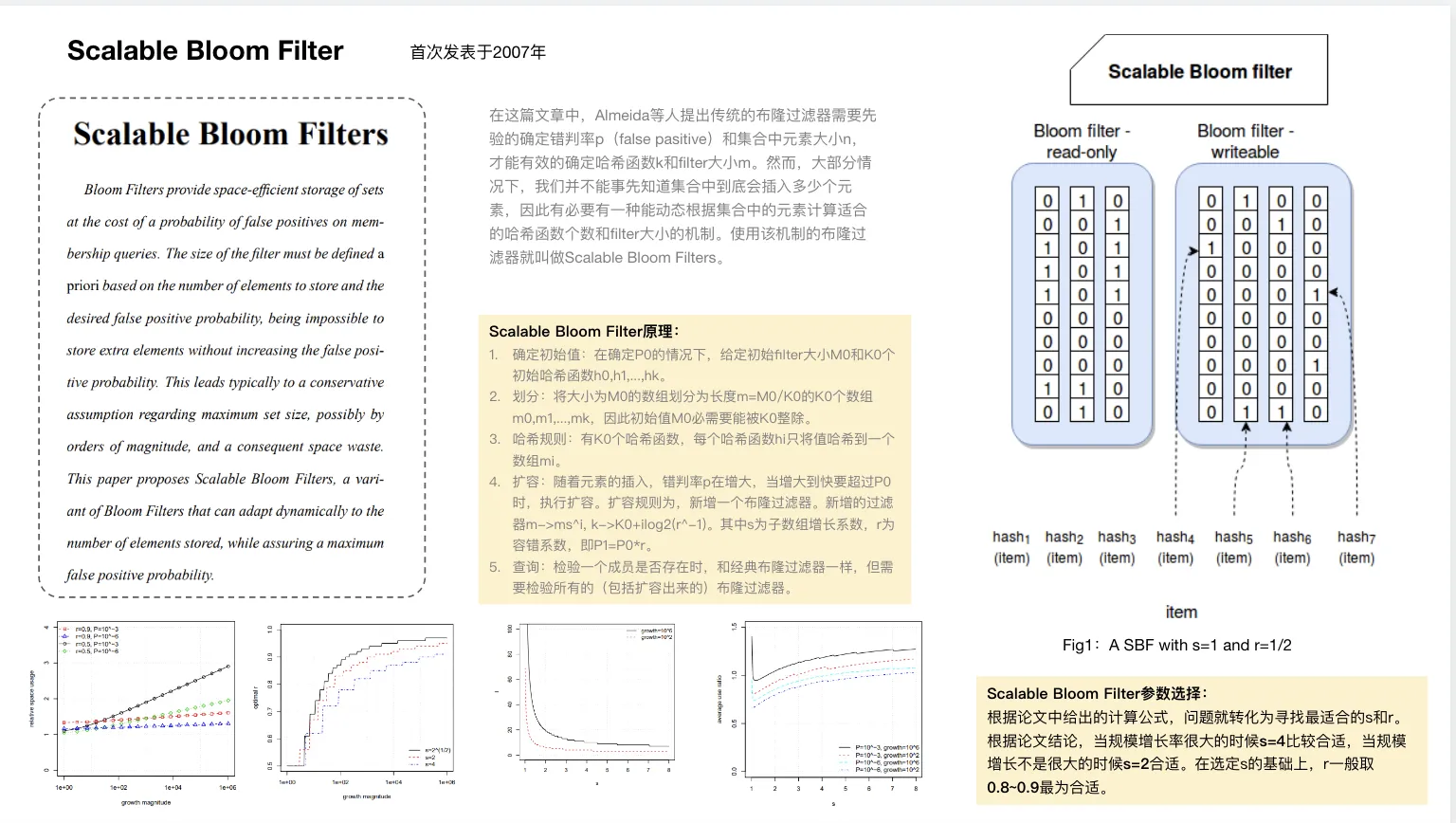 - 扩容:随着元素的插入,错判率p在增大,当增大到快要超过P0时,执行扩容。扩容规则为,新增一个布隆过滤器。新增的过滤器m->ms^i, k->K0+ilog2(r^-1)。此时旧的布隆过滤器变为只读,新的布隆过滤器可读写。其中s为子数组增长系数,r为容错系数,即P1=P0*r。