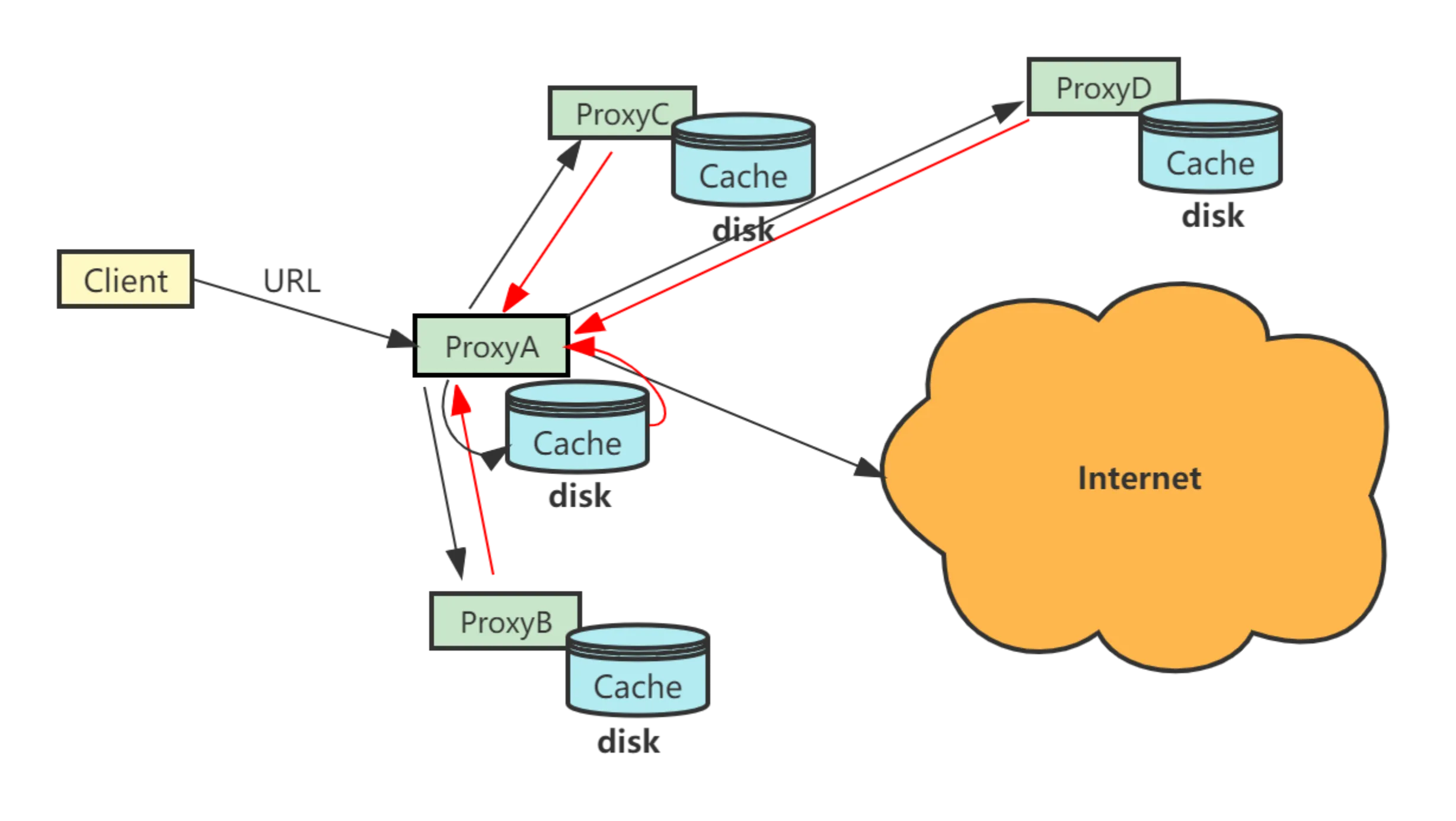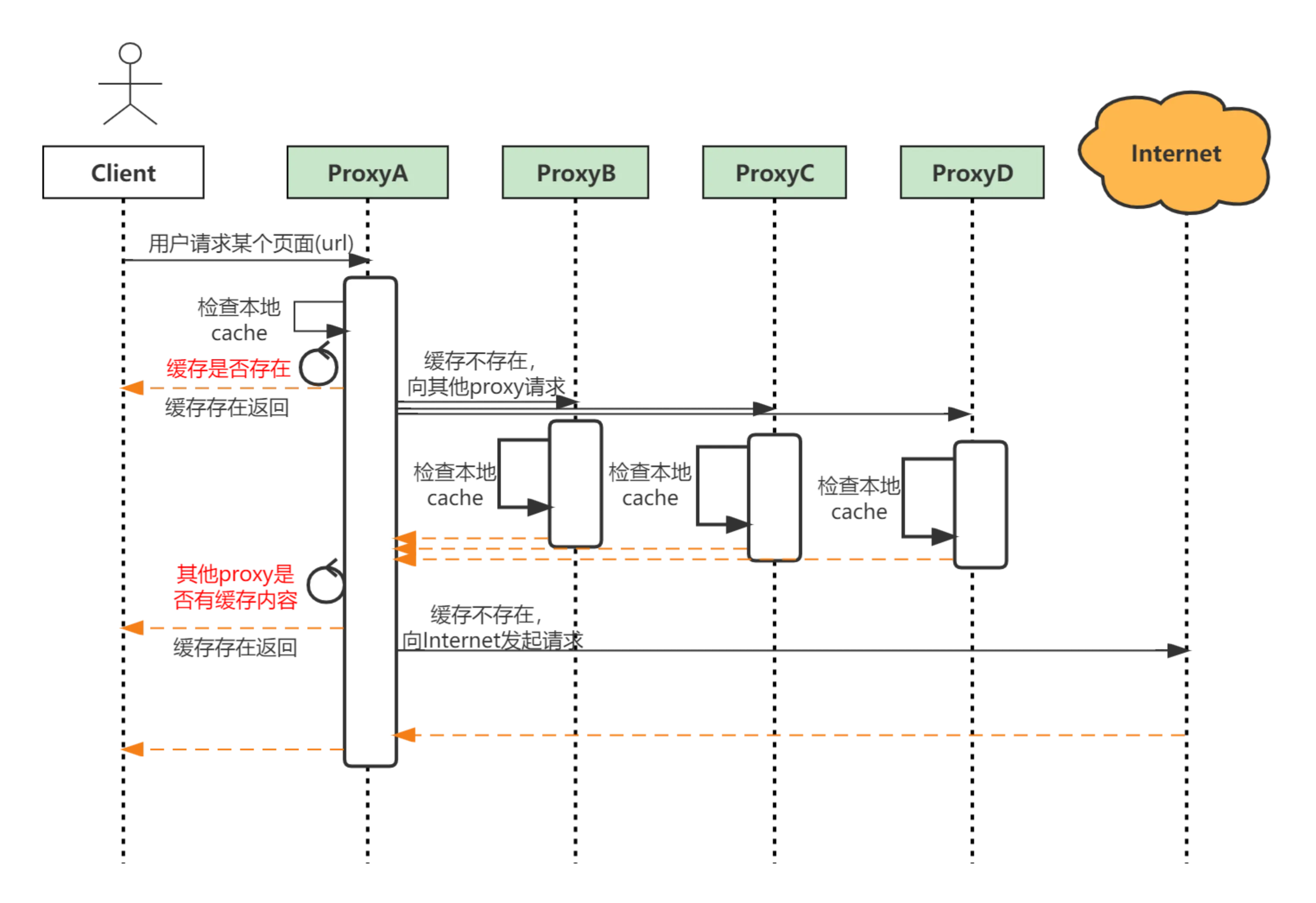 背景:传统的网络缓存服务器,通常会根据过期时间,缓存一批最近访问过的地址的网页信息。这时如果用户再次请求相同地址,即可从本地缓存中将网页信息取出返回给用户,无需经过真正的网络路由到外部真实的资源服务器。然而当用户请求的地址没有被proxy缓存时,该proxy会向网络中的其他proxy发送请求。如果其他proxy有网页信息,则会把信息返回给用户;如果其他proxy也没有网页信息,则会通过互联网将请求发送至目标服务器。
