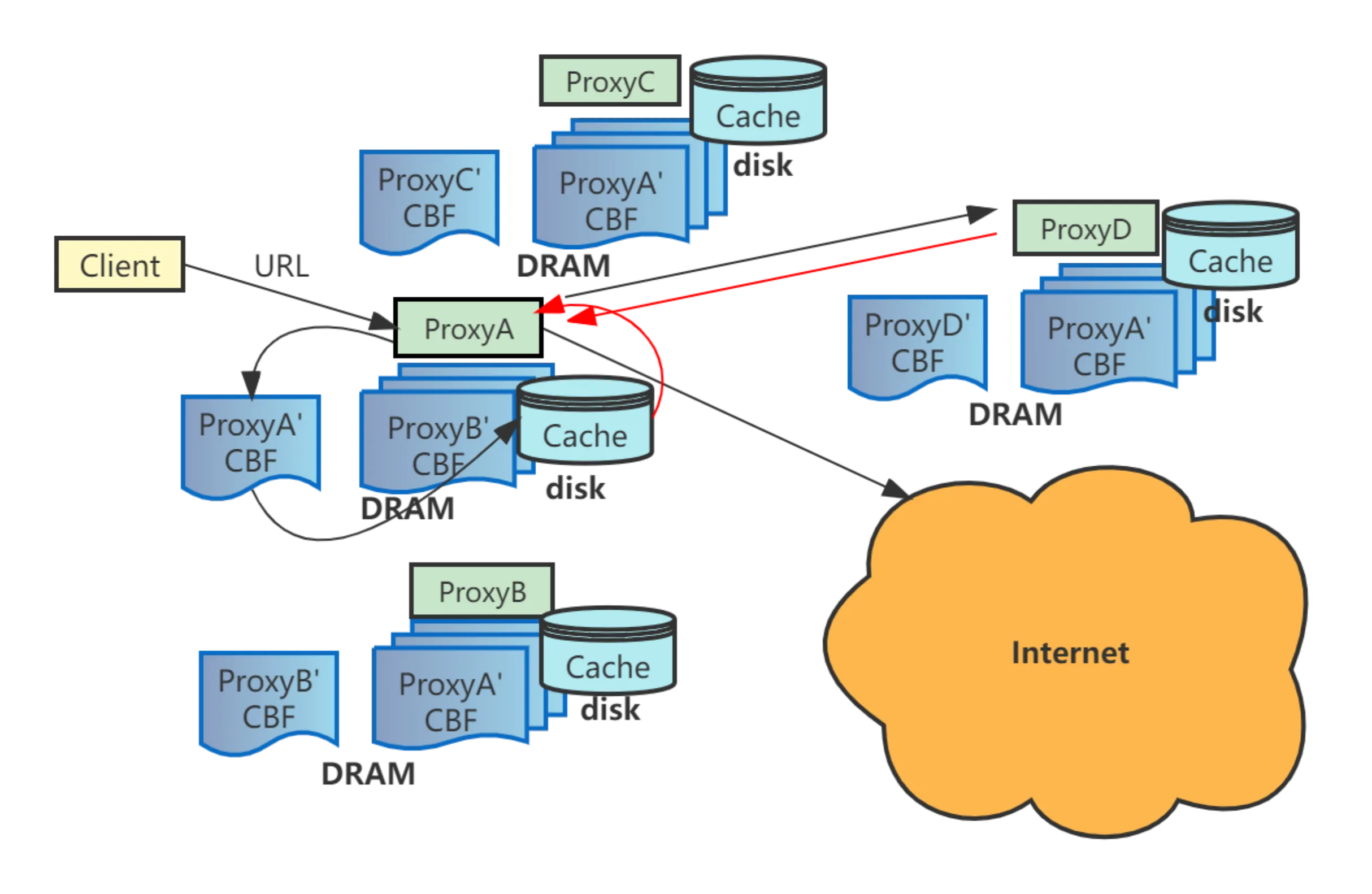 使用CBF后,每个Proxy维护一个自己的CBF,存储于内存中,记录各自的缓存集合信息。各个Proxy向其他Proxy同步自己的CBF,这样每个Proxy都能得到其他Proxy缓存的信息。同步时机可以定时同步或者设置一个缓存更新的阈值,当缓存更新超过该阈值时,向其他Proxy同步自己的CBF。