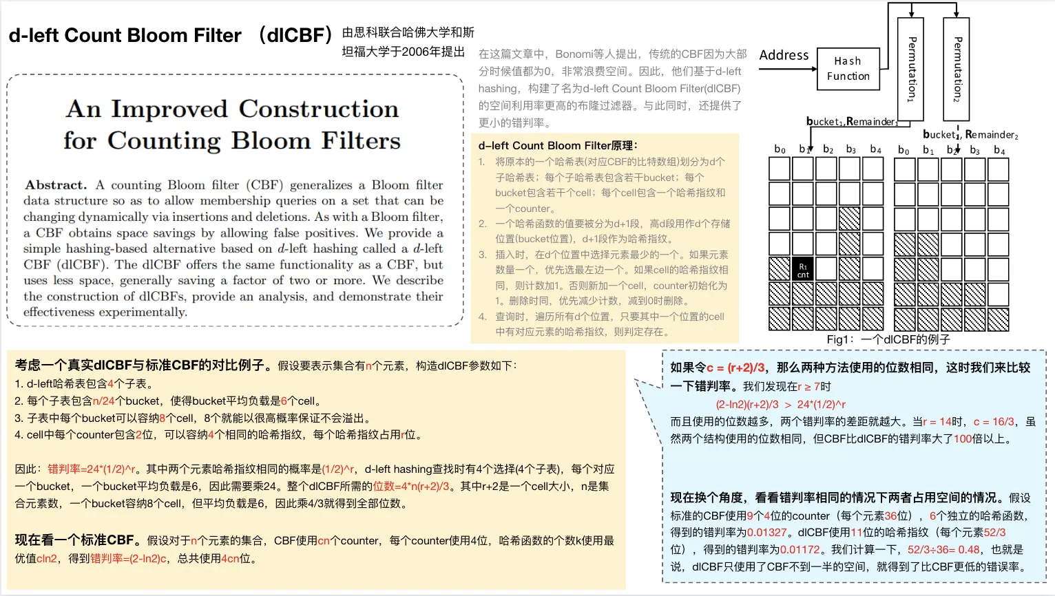 可见,d-left中的'd'描述的是将原来的哈希表拆分为多少张子表,而'left'描述的是选取桶位置的原则,即有限选取桶内cell少的,如果cell一样多,优先选择最左的桶。通过使数据存储的更加均匀和密集,dlCBF才能节省更多的空间。关于d-left hashing,可以参考[D-left hashing_风云龙儿的博客-CSDN博客_d-left哈希解决了什么问题。]https://blog.csdn.net/hanchengxi/article/details/9463839)