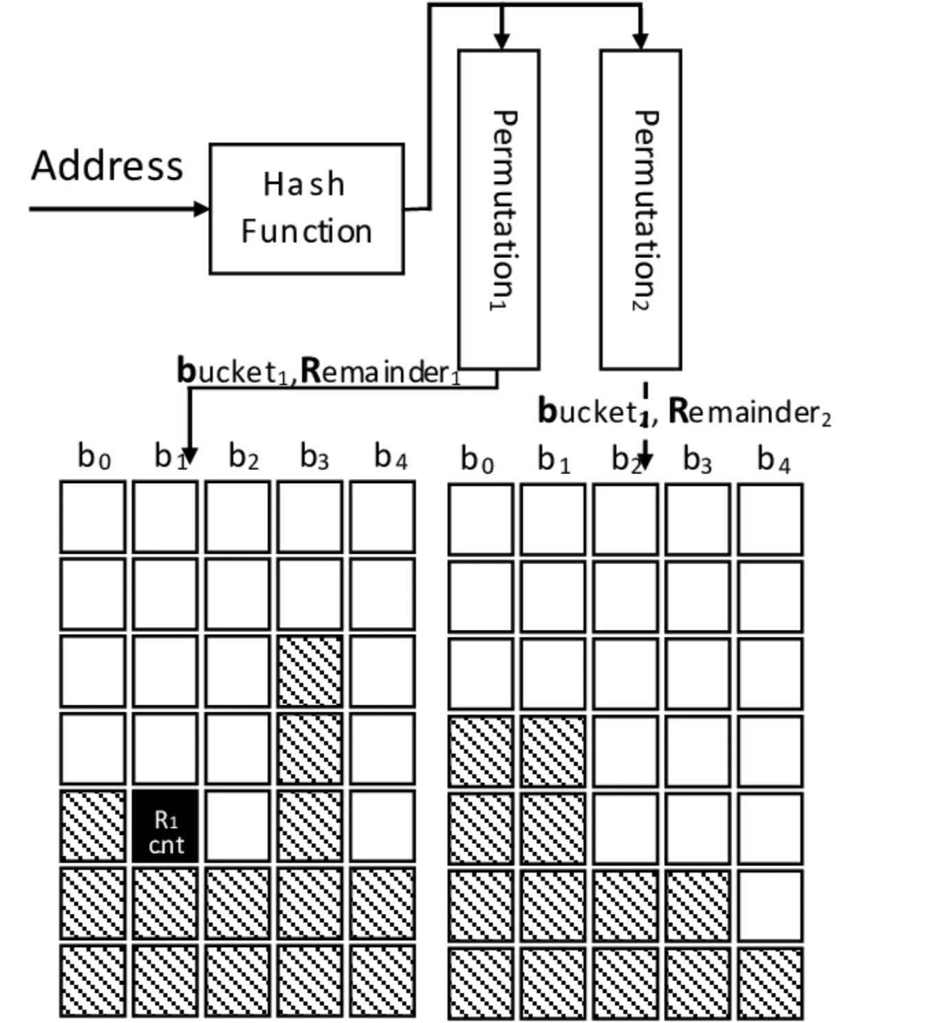 - 地址经过哈希函数,得到一个哈希值,哈希值包括2+1段(bucket1,bucket2,Remainder1=Remainder2),忽略随机置换过程。其中bucket1和bucket2指定元素落在2个哈希子表的哪个桶中,而Remainder当做哈希指纹。