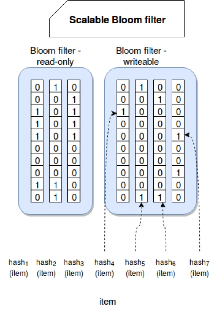 在这篇文章中,Almeida等人提出传统的布隆过滤器需要先验的确定错判率p(false pasitive)和集合中元素大小n,才能有效的确定哈希函数k和过滤器大小m。然而,大部分情况下,我们并不能事先知道集合中到底会插入多少个元素,因此有必要有一种能动态根据集合中的元素计算适合的哈希函数个数和filter大小的机制。使用该机制的布隆过滤器就叫做Scalable Bloom Filters。
