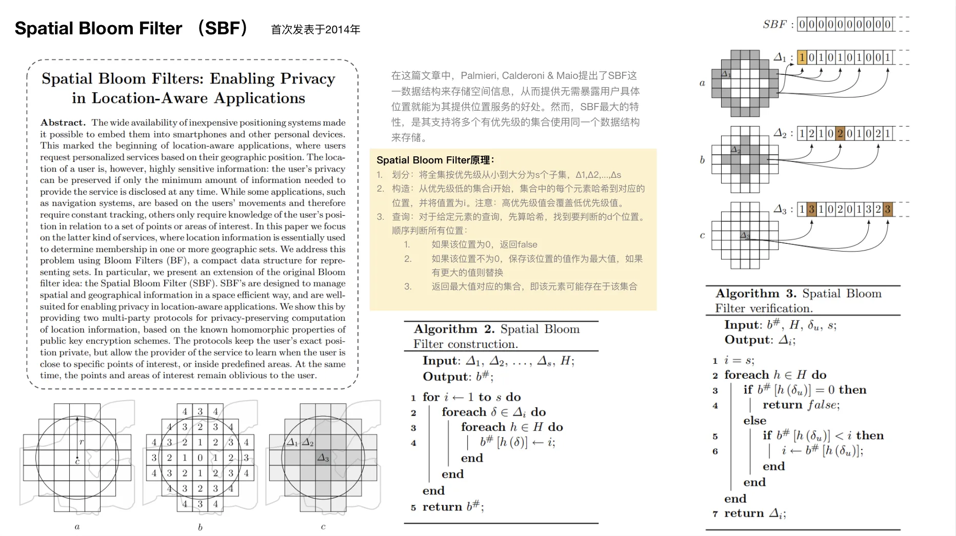 在Spatial Bloom Filters: Enabling Privacy in Location-Aware Applications这篇文章中,Palmieri,Calderoni & Maio提出了SBF这一数据结构来存储空间信息,从而提供无需暴露用户具体位置就能为其提供位置服务的好处。然而,SBF最大的特性,是其支持将多个有优先级的集合使用同一个数据结构来存储。