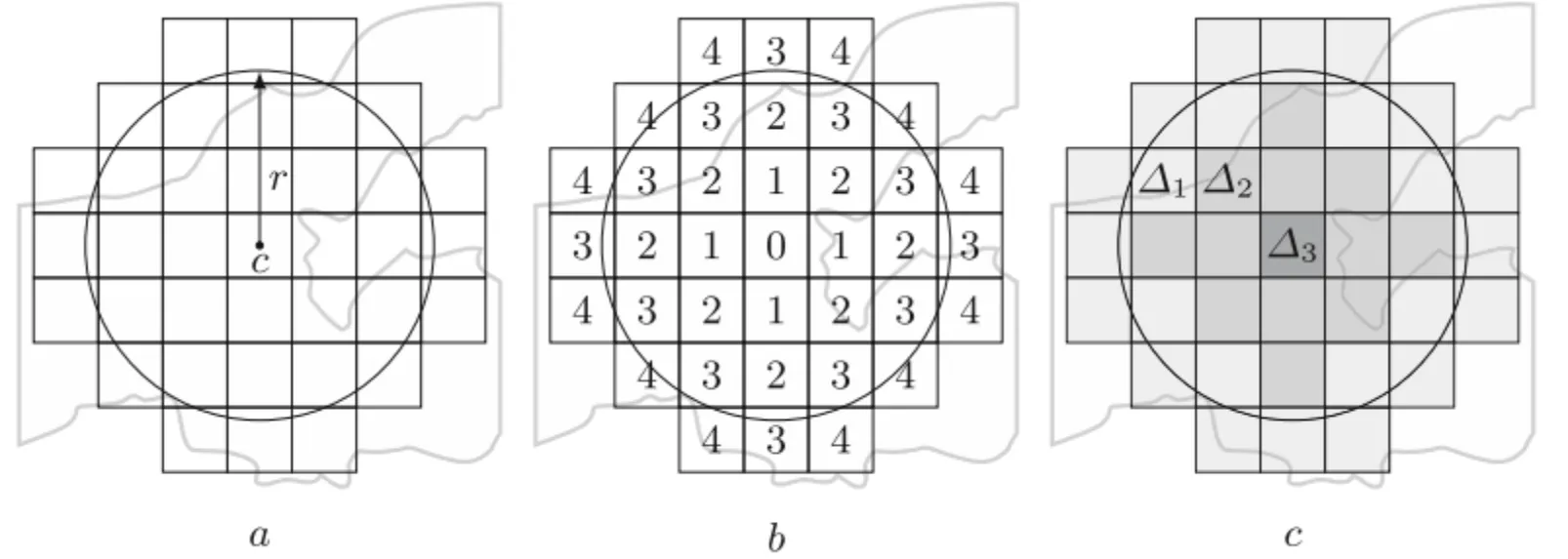 - 把c点所在的区域距离设为0,计算圆覆盖范围区域δ与c的曼哈顿距离。